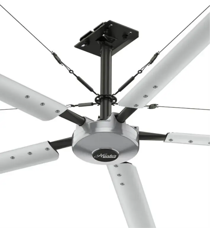 El soporte de aspas HVLS patentado por Hunter Industrial está fabricado en acero de calidad estructural con un sistema redundante de fijación de las aspas. El soporte de aspas se introduce profundamente en la cavidad de las aspas para una fijación segura a las aspas del ventilador. Cada aspa del ventilador HVLS está fabricada en aluminio 6005A, conocido por su resistencia, flexibilidad y ligereza. Esta combinación produce un aspa de ventilador HVLS ligera e increíblemente fuerte que crea un flujo de aire importante.